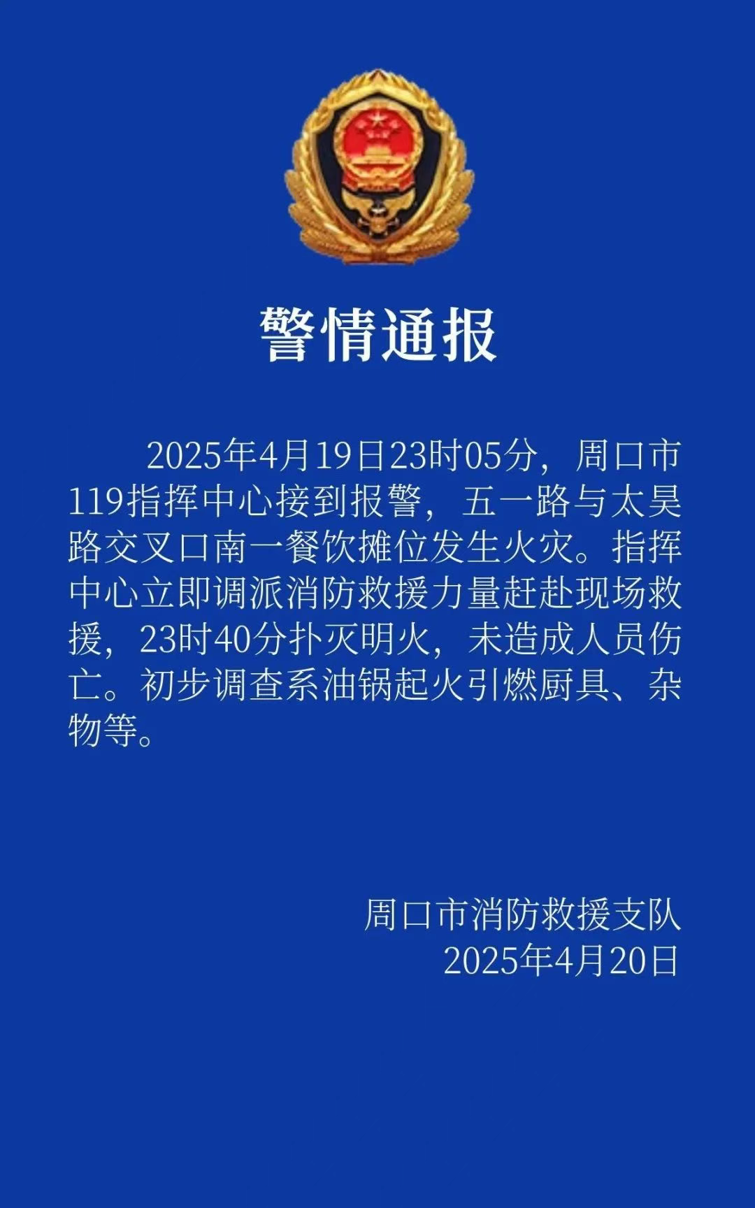 4月20日,周口消防发布警情通报:2025年4月19日23时05分,周口市119指挥中心接到报警,五一路与太昊路交叉口南一餐饮摊位发生火灾。指挥中心立即调派消防救援力量赶赴现场救援,23时40分扑灭明火,未造成人员伤亡。初步调查系油锅起火引燃厨具、杂物等。